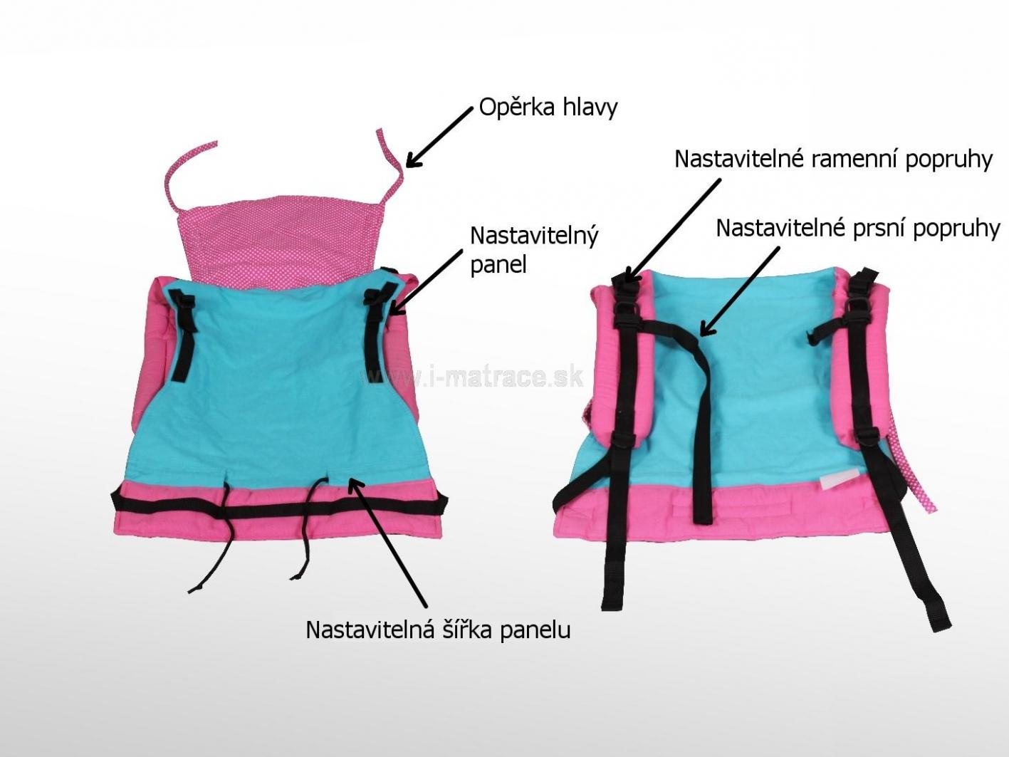 Vďaka nastaviteľným polstrovaným popruhom s prackami na prispôsobenie rastu dieťaťa pre Vás ani pri vyššej váhe Vášho dieťatka nepohodlné. Naopak Vám i dieťaťu zaistí dostatočnú oporu a pohodlné upevnenie. Bočnými popruhy je možné skrátiť panel a bočné oporu. Nepostrádateľná je tiež správne nastaviteľná opierka hlavy, ktorá chráni dieťa pred slnkom, vetrom a zabezpečuje mu oporu hlavy.