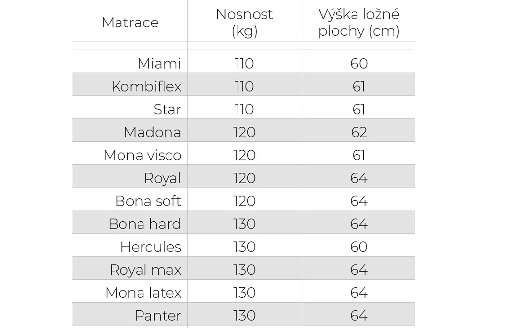 Súčasťou postele je lamelový rošt Relax s prístupom k úložnému priestoru z boku . K lôžku je možné zvoliť matrac, ktorý má snímateľný a prateľný poťah. Korpus je uložený na nožičkách s výškou 15 cm (pri základnom korpuse)
