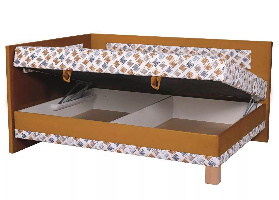 Súčasťou postele je pevný smrekový rošt a pružinový matrac Kombiflex . Úložný priestor sa otvára z boku. Poťah matraca je prešitý . Celá konštrukcia postele stojí na nôžkach s výškou 15 cm.