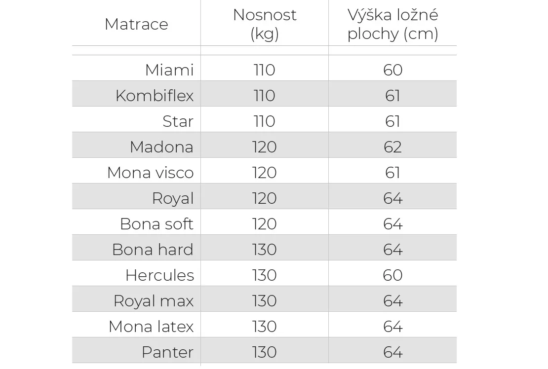 Nosnosť - podľa typu úložného priestoru a matraca.