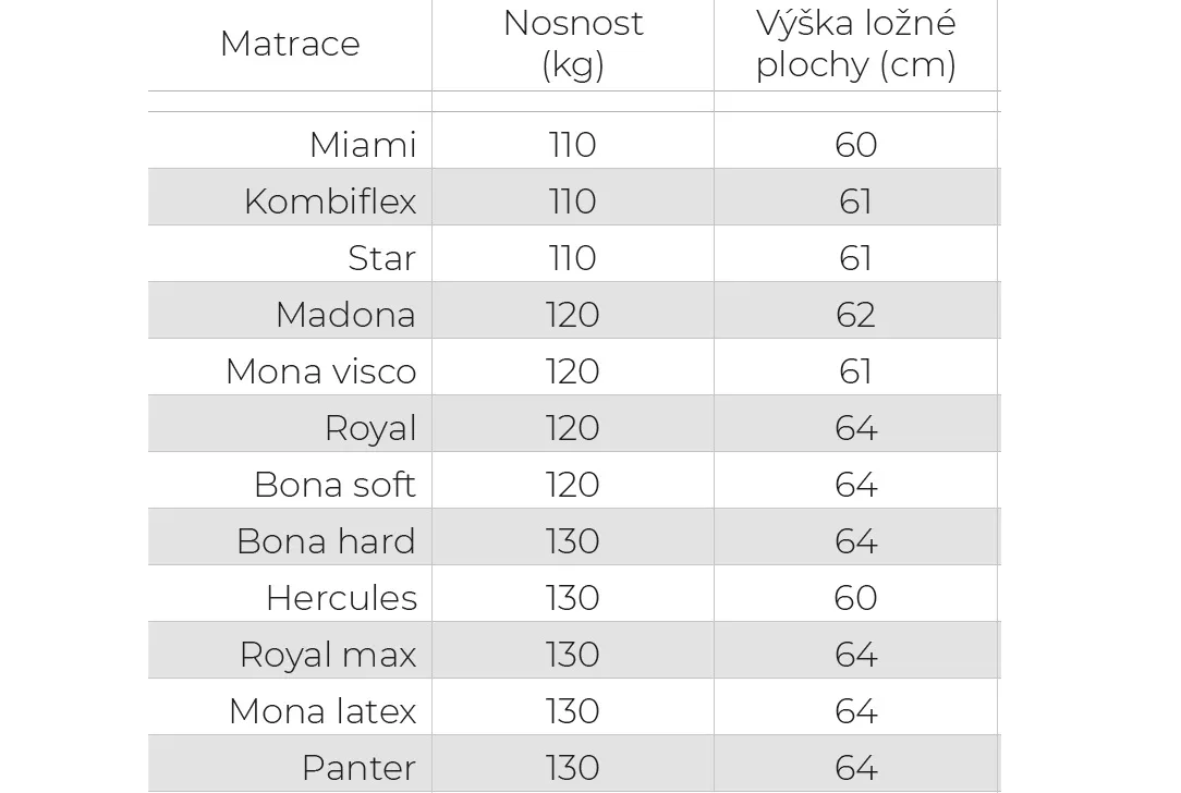 Nosnosť - podľa typu úložného priestoru a matraca.