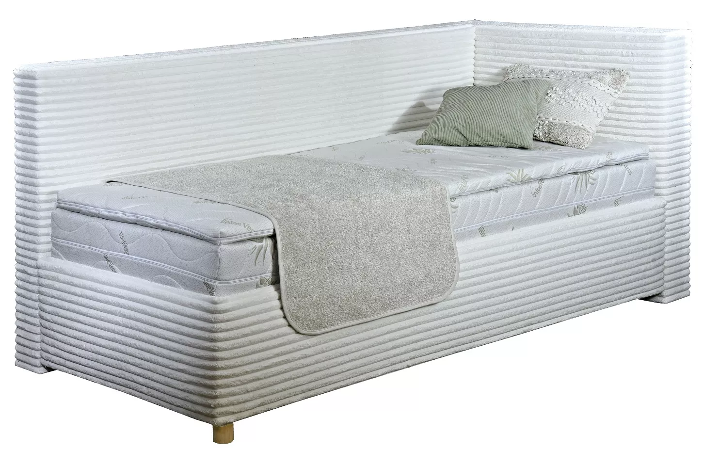 Iste oceníte aj úložný priestor na uskladnenie lôžkovín. Bočnice sú vyrobené z bieleho lamina hrúbky 18 mm. Dno je vyhotovené z bielej MDF. Pohľadové strany sú zmäkčené polyesterovým rúnom. Uchytenie okrasnej nohy je riešené oceľovým výliskom.