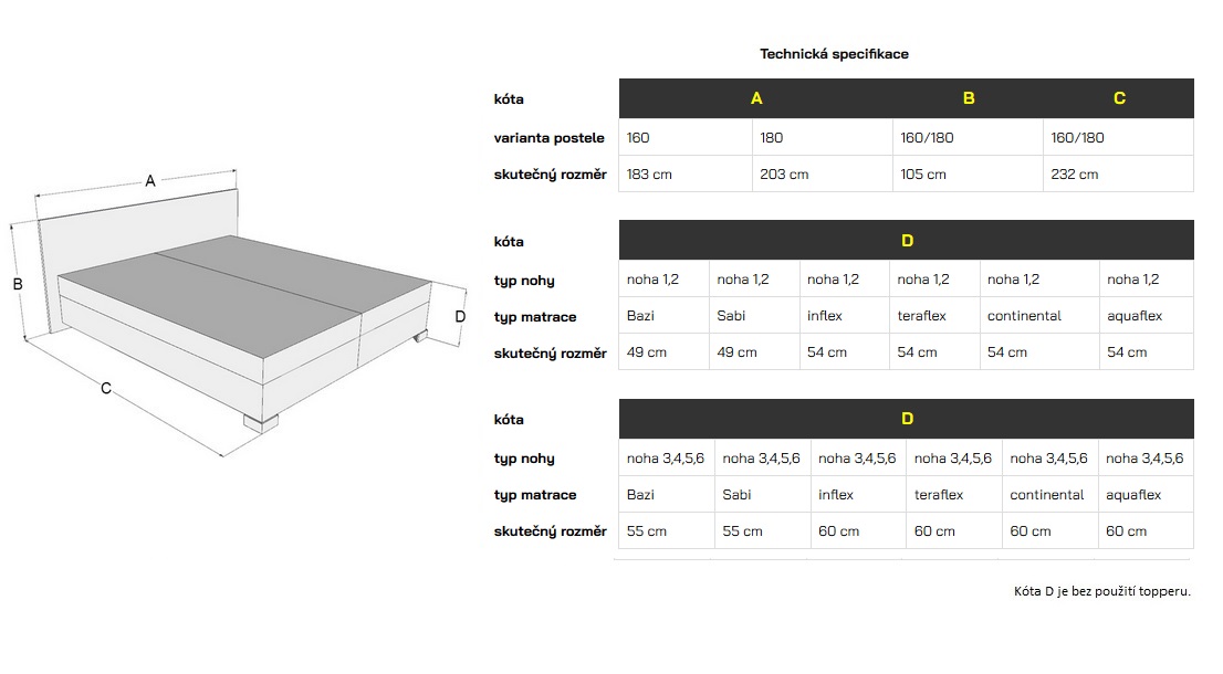 Materiál korpusu postele je z bieleho lamina hrúbky 18 mm, dno potom z bielej MDF. Pohľadové strany sú zmäkčené polyesterovým rúnom. Uchytenie okrasnej nohy je oceľovým výliskom (noha sa zaskrutkuje do výlisku). Spojenie pravej a ľavej strany letiska sa prevádza stredovou oceľovou nastavovacou nohou.