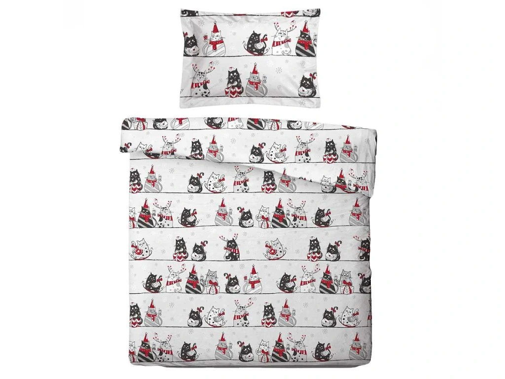Obliečky Mikroflanel Mačky na streche značky SLEEP WELL prinášajú do spálne radostnú zimnú atmosféru. Veselý motív mačiek v šálach a čiapkach na bielom podklade so snehovými vločkami pôsobí hravo a útulne? ideálna voľba pre zimné obdobie aj pre milovníkov zábavných designov.