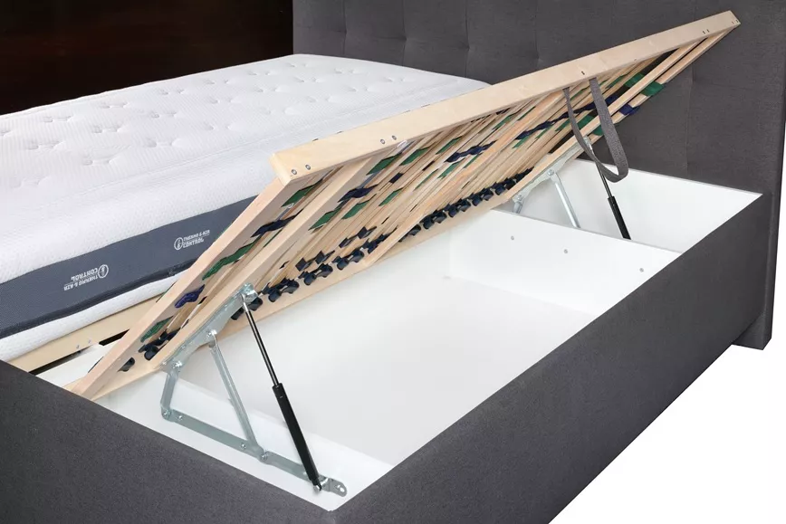 Rošty s nosnosťou 150 kg na každú polovicu postele. Pri rovnomernom rozložení tela. Stredná časť má nastaviteľnú tuhosť vďaka zdvojeným lamelám. Výklopné rošty umožňujú pohodlný prístup do veľkých úložných priestorov. Tento mechanizmus je zaistený plynokapalinovými vzperami a madlom vo farbe postele.