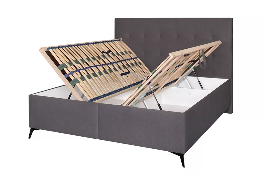 Posteľ Venuša predstavuje elegantné a praktické riešenie pre moderné spálne. Jej čalúnená základňa v tvare boxu zaisťuje pevnosť, stabilitu a dlhú životnosť. Každý box je vybavený odvetrávaným úložným priestorom, ktorý je ľahko prístupný pomocou bočných výklopných roštov s plynovými vzperami. Tento systém umožňuje pohodlné otváranie aj pri každodennom používaní.