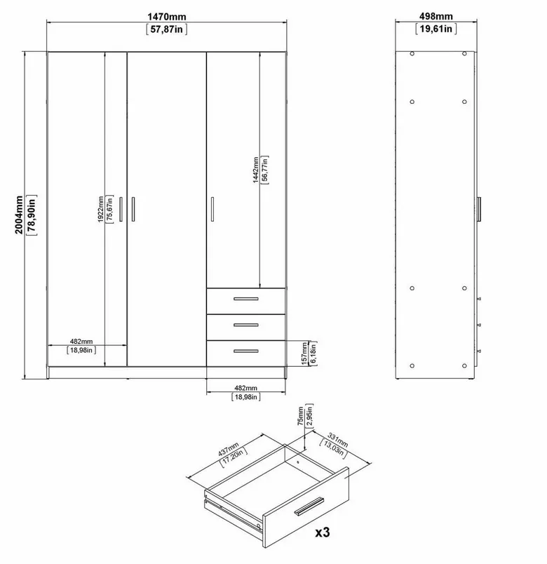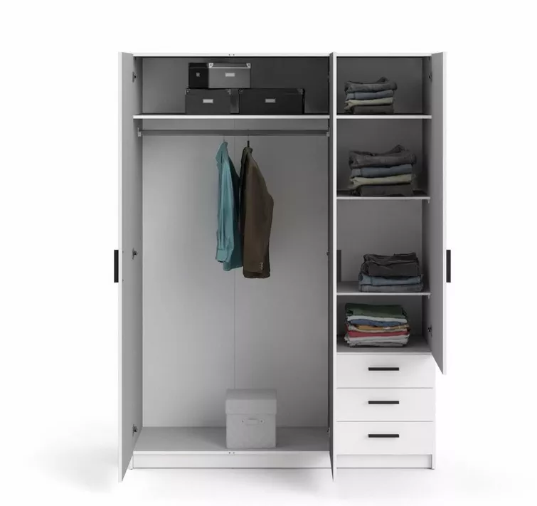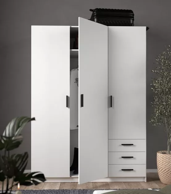 Šatníková skriňa Spike 085 je praktická voľba pre každého, kto chce mať oblečenie aj drobnosti prehľadne uložené na jednom mieste. Vďaka šírke 147 cm ponúka dosť priestoru do spálne, detskej izby aj predsiene. Vnútri nájdete šatníkovú tyč na zavesenie oblečenia a nastaviteľné police, ktoré si ľahko prispôsobíte podľa toho, čo práve potrebujete ukladať. Veľkým bonusom sú aj tri zásuvky - ideálne na spodnú bielizeň, doplnky alebo veci, ktoré chcete mať rýchlo po ruke.