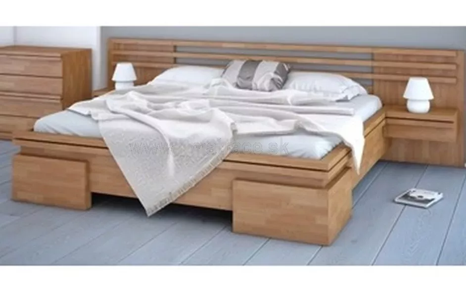 Drevená posteľ z masívu Azzo. Jedná sa o posteľ v modernom dizajne, kde je čelo širší ako samotný rám postele a sú v ňom zakomponované nočné ...